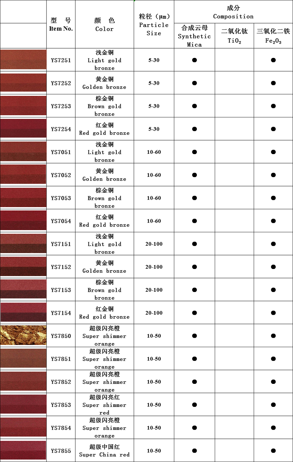 水晶珠光顏料系列:本系列產(chǎn)品以精選人工合成云母為基材,通過精準(zhǔn)控制不同金屬氧化物的包覆厚度從而產(chǎn)生閃爍奪目,璀璨亮麗的珠光效果。產(chǎn)品包括:水晶超白系列、水晶虹彩系列,水晶金色系列、水晶金屬系列、水晶彩色系列、水晶高光系列等。