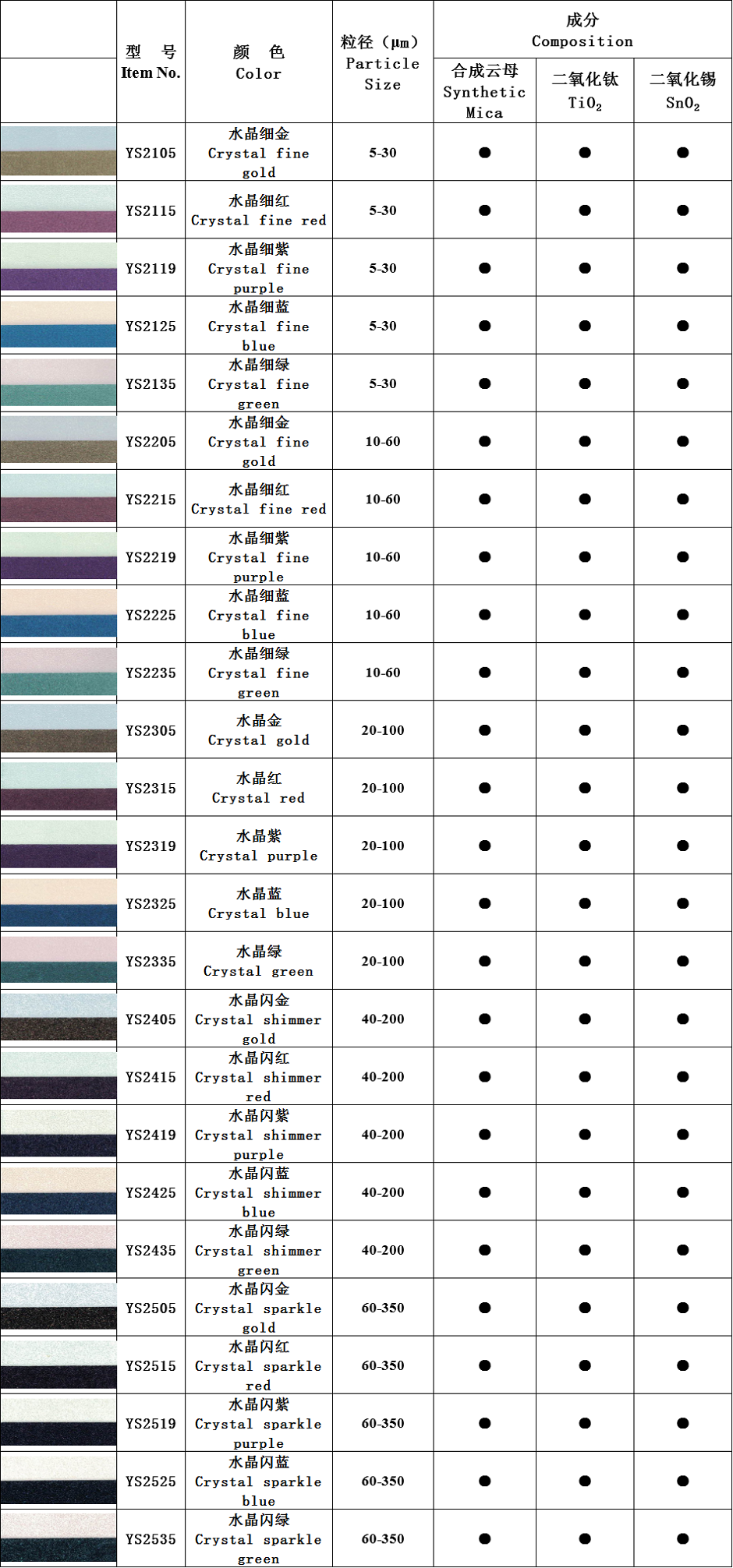 水晶珠光顏料系列:本系列產(chǎn)品以精選人工合成云母為基材,通過精準(zhǔn)控制不同金屬氧化物的包覆厚度從而產(chǎn)生閃爍奪目,璀璨亮麗的珠光效果。產(chǎn)品包括:水晶超白系列、水晶虹彩系列,水晶金色系列、水晶金屬系列、水晶彩色系列、水晶高光系列等。
