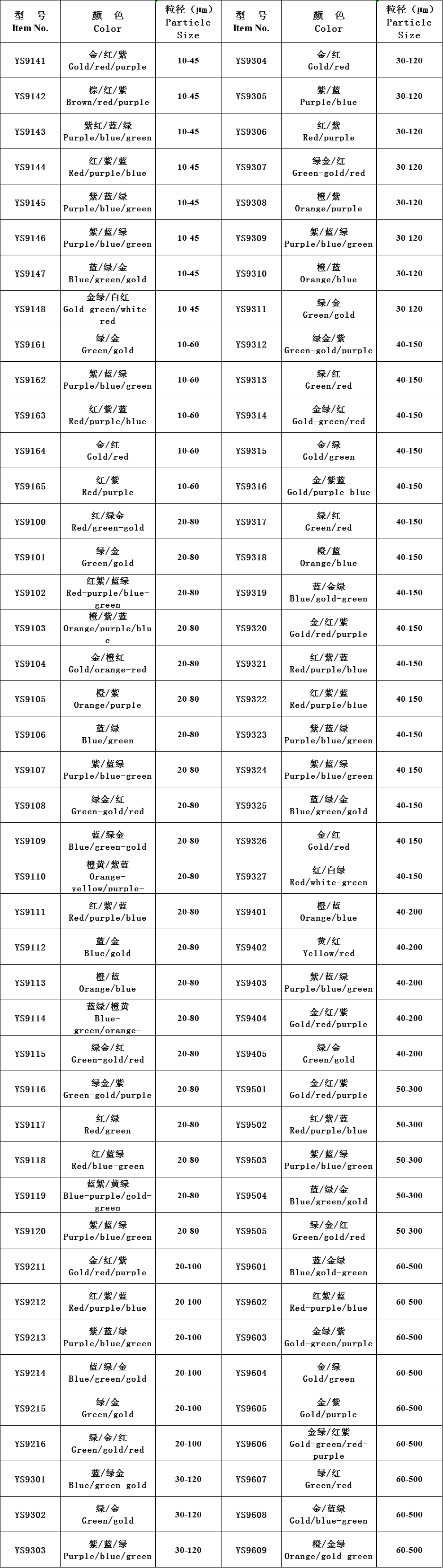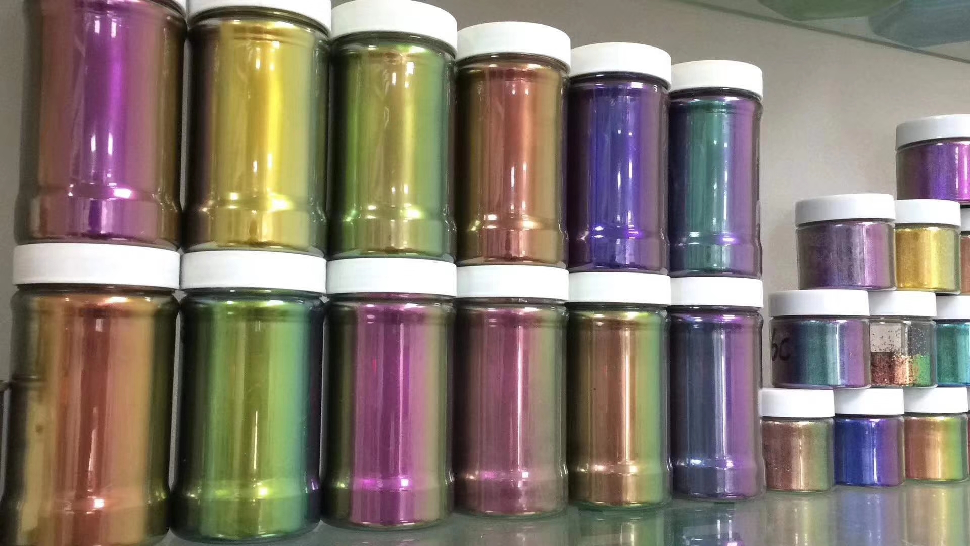 變色龍系列:本系列產(chǎn)品使用高透明度的新型片狀合成云母、玻璃片等為基材,通過多層疊加包覆技術(shù),精準(zhǔn)控制不同金屬氧化物的厚度,而形成的新型的效果顏料;可隨著觀察角度和光照角度的變化而呈現(xiàn)出不同的顏色變化,有著夢幻般色彩和高鏡面效果。我司產(chǎn)品色澤豐富,規(guī)格、種類齊全。