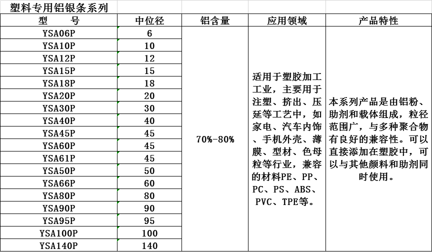 本系列產(chǎn)品是由鋁粉、助劑和載體組成,粒徑范圍廣,與多種聚合物有良好的兼容性??梢灾苯犹砑釉谒苣z中,可以與其他顏料和助劑同時(shí)使用。