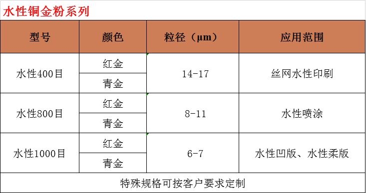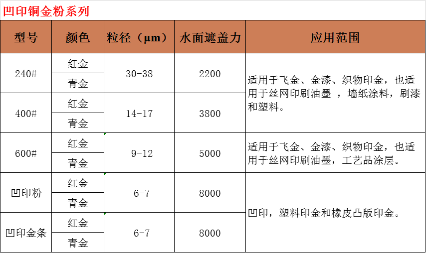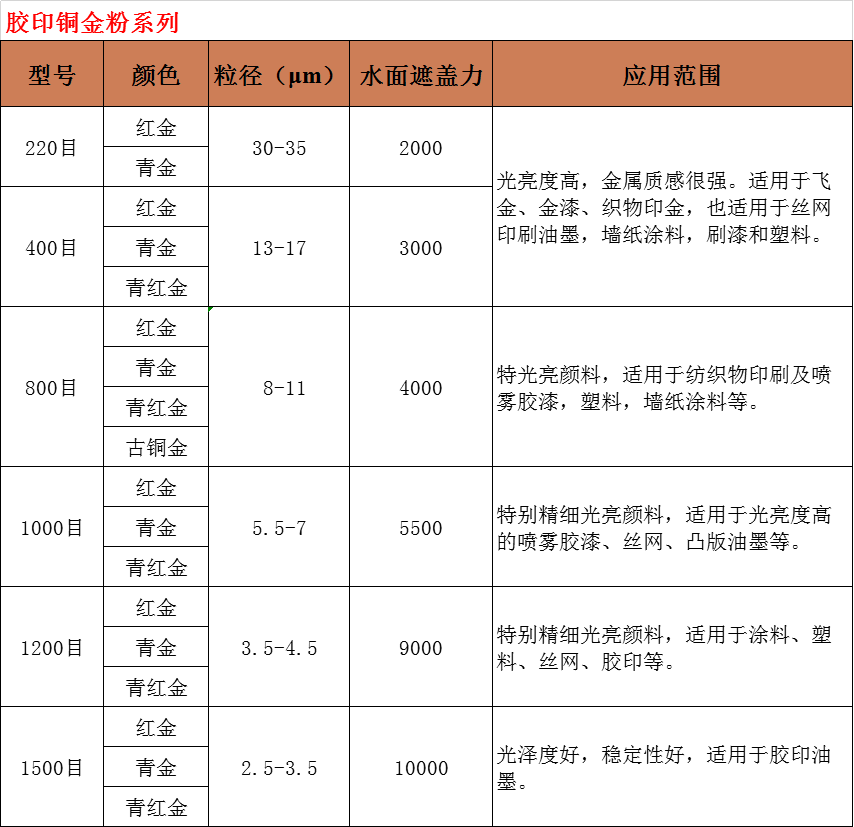 銅金粉是一種以銅、鋅為主要原料,經(jīng)過熔煉、球磨、拋光等工序加工的極細微的鱗片狀金屬粉末,又稱銅鋅金粉,俗稱金粉。 我司銅金粉色相有:紅金、青金、青紅金、古銅金等。 銅金粉表面有脂肪酸保護層,高溫、水、汗、堿性介質(zhì)都很容易破壞其表面的保護層,進而使之緩慢氧化,逐漸失去原有金屬光澤。 銅金粉使用過程中應盡量避免使用硝基纖維素和環(huán)氧樹脂,因二者均會與銅發(fā)生化學反應而生成膠狀物,也應盡可能選用低酸值(小于3)的樹脂,樹脂經(jīng)系列的酸值越低越好。溶劑優(yōu)先選用芳烴類和酯類,避免選用醇類、酮類以及酸化不完全的脂類。